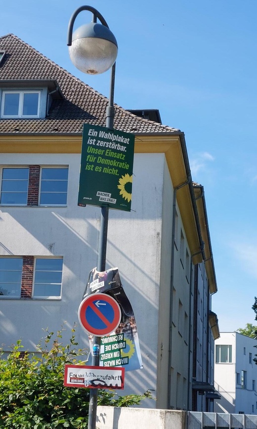 Wolfgang Freese, Sprecher des Kreisverbands, ergänzt: „Der zweite Schwung Plakate ist bereits angekommen. Das wichtigste Motiv: ‚Ein Wahlplakat ist zerstörbar. Unser Einsatz für die Demokratie ist es nicht.' Dafür stehen wir, diese Botschaft werden wir verbreiten. Wir rufen auch die anderen demokratischen Parteien in OPR auf, Mittel aus diesem Fonds zu beantragen. Wir alle spüren und wissen, dass die Zerstörung massiver geworden ist. Demokrat*innen müssen zusammenhalten!"