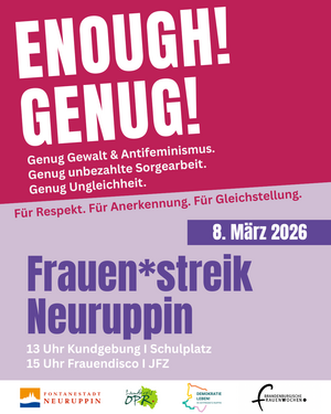 Unter dem Motto „ENOUGH! GENUG!“ rufen wir Frauen* in Ostprignitz-Ruppin und Umgebung dazu auf, sich miteinander zu solidarisieren, laut und sichtbar mit ihren Forderungen zu sein.